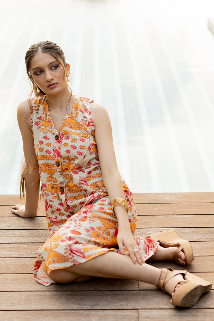 A timeless piece that effortlessly combines the grace of a midi length with the chic appeal of an entire button-front design. This dress, in a serene ivory hue, is adorned with delicate prints, creating an ensemble that exudes sophistication and beauty.