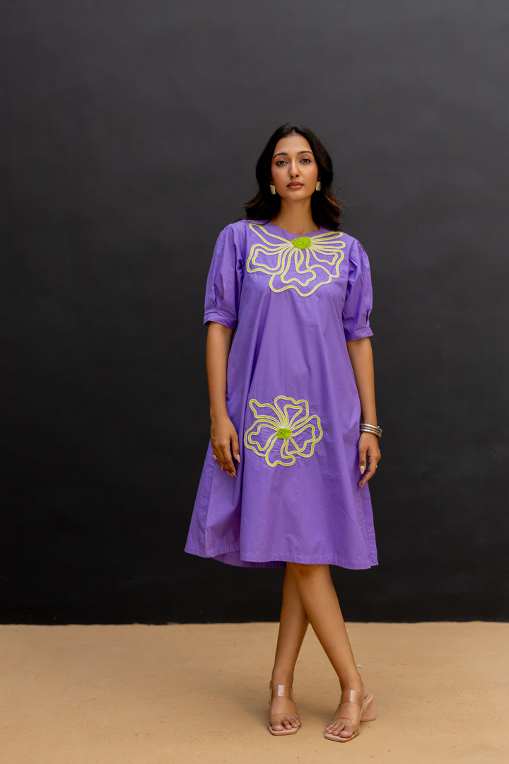 This puff-sleeve beauty in lavender is giving major main character energy with its big, bold white floral embroidery – one stealing the show on the chest and more blooming just above the hemline. The 3/4 length makes it brunch-perfect, date-approved, and nap-worthy all in one go.