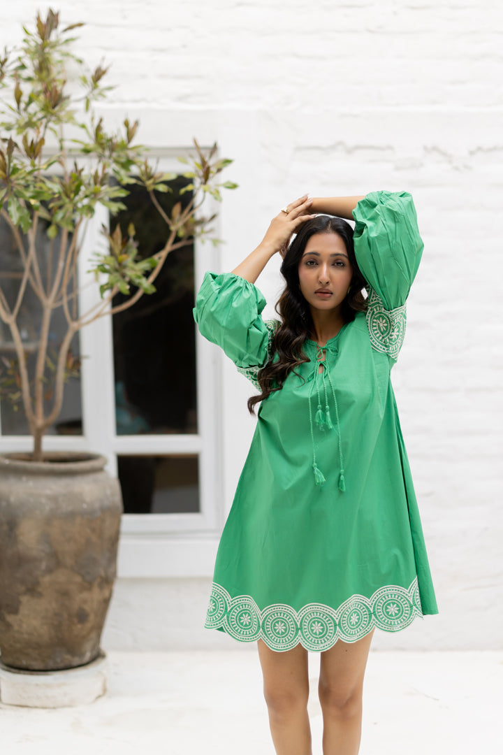 Your new go-to dress when basic just won’t cut it. Dipped in a bold, juicy green, this dress is all things sweet, sassy, and slightly dramatic (in the best way). The statement balloon sleeves bring the flair, while the big, beautiful embroidered circles at the hem and cuffs bring the fun